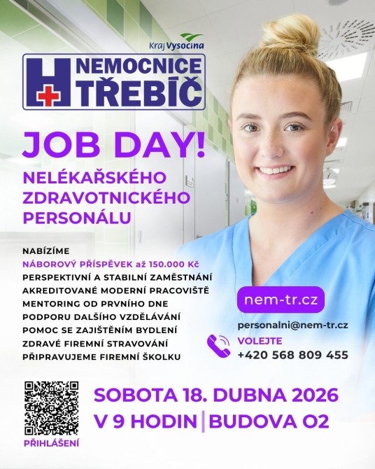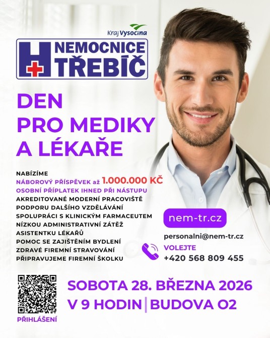 Třebíč, 23. 3. 2026 – V Nemocnici Třebíč připravujeme na jaře roku 2026 dvě akce určené lékařům, medikům i nelékařským zdravotnickým profesím. Chceme zájemcům osobně představit naše pracoviště, odborné týmy i konkrétní podmínky spolupráce včetně mimořádné finanční podpory, která může u vybraných odborností dosáhnout až jednoho milionu korun. Pro lékaře máme k dispozici byty v novostavbě.